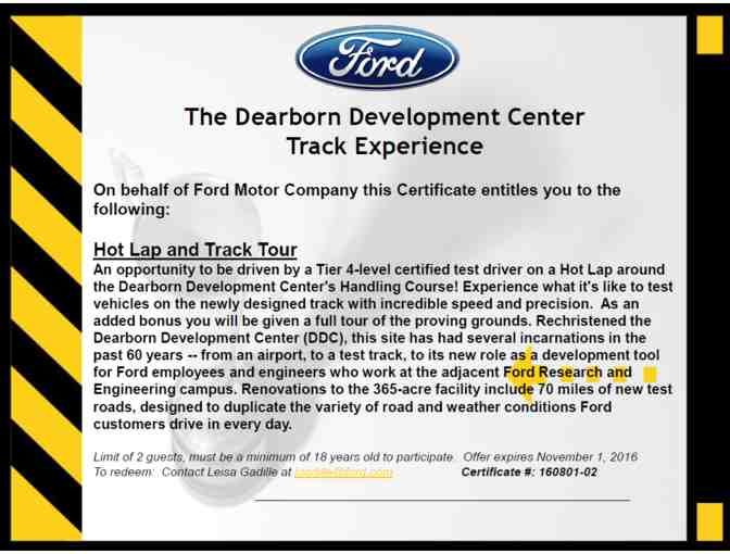 Limit of 2 guests, must be a minimum of 18 years old to participate. Offer expires November 1, 2016 To redeem: Contact Leisa Gadille at lgadille@ford.com