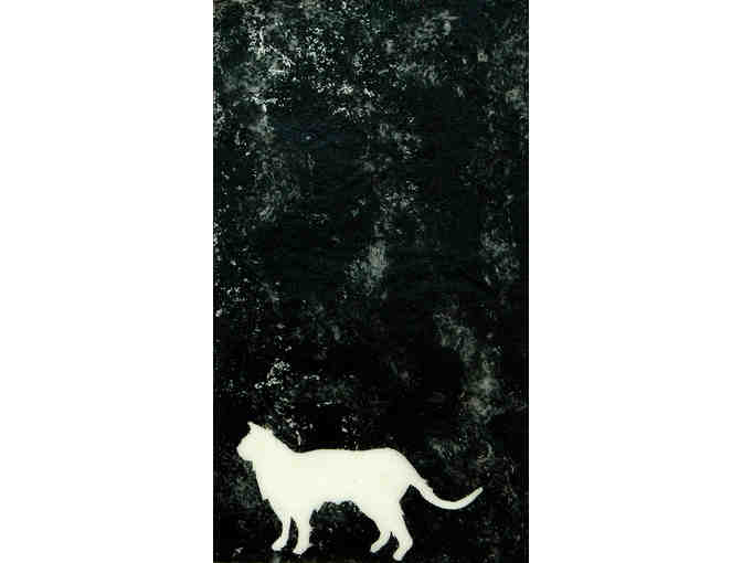 Enjoy this beautiful hand-pulled print by award winning artist, Florence McEwin. This work is a carborundum and vegetation collagraph print with stencil. This slightly embossed image is the sister print to the loyal dog waiting print. Print Size is 11.5" x 6.5 " and presented in a wooden frame.