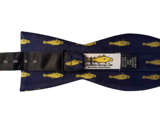 This Golden Cod Design man's bow tie is 100% silk (navy), stain resistant, and adjusable from 13 3/4 to 18 1/2 . This tie is great for weddings, black tie events, or a simple summer night! Decal included It features the Golden Cod logo. The Golden/Sacred Cod is a traditional symbol of New England fishing industry. The Cod was the first export of the Massachusetts Bay Colony and the basis of the states economy until the Industrial Revolution. Because of the importance of the cod industry, a wooden carving of a painted codfish has hung in the House of Representatives Chamber in the Massachusetts State House in Boston since the early 18th century, as well as on church steeples and above doorways all around New England. GoldenCodDesign chose to put this revered symbol on our high quality clothing so the wearers could proudly show their connection to New England. However, people across the country have now purchased our hats and ties and belts making the cod more than just a local symbol.