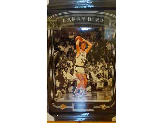 Signed Larry Bird Photo (23 x 32) with Game used parkquet & net inserts!
