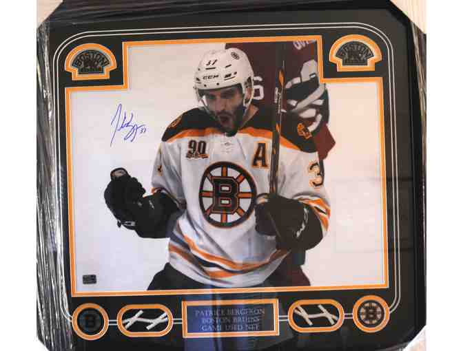 Bruins Great Patrice Bergeron! Signed with inserted pieces of net and logos! (27 x 25)