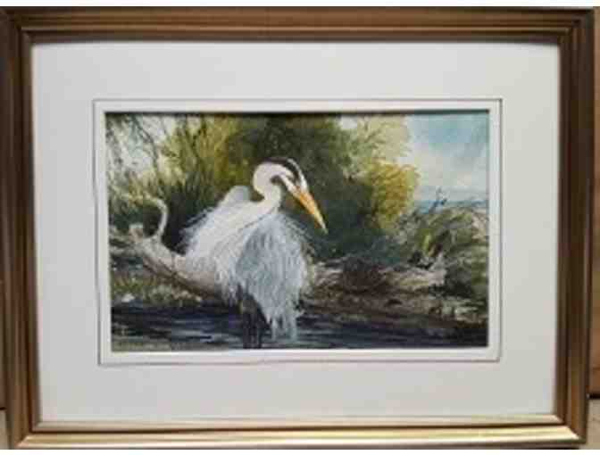 "We Let the Big Ones Go" Original watercolor with guache and pen of Great Blue Heron confronting LARGE Blanding's turtle, 13 x17 matted under glass in wood silver/gold frame.