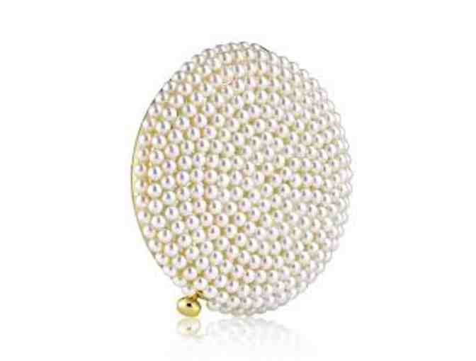 Elegance at your fingertips, this golden round compact is covered in lustrous faux pearls.