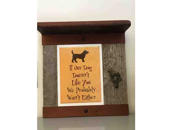 Leash hanger with a shelf measures 15"x15" made out of richly stained and reclaimed woods. Includes a plaque that says "If Our Dog Doesn't Like You We Probably Won't Either"