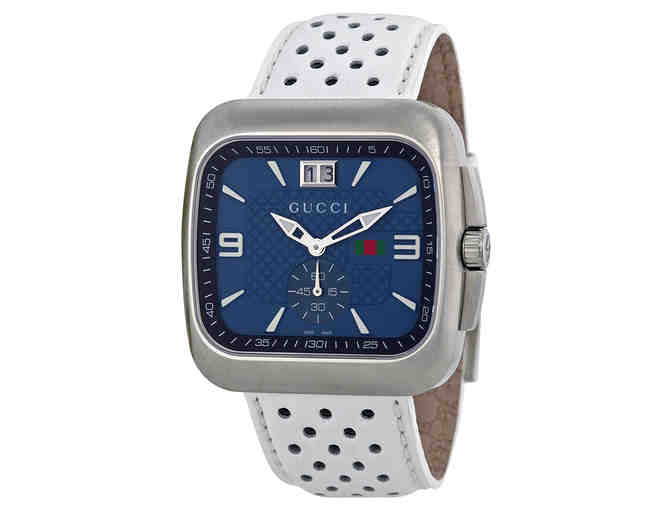 You are bidding on a Gucci G Coupe Quartz Blue Dial Leather Strap Watch. Stainless steel case with a white perforated leather strap. Fixed stainless steel bezel. Blue dial with luminous silver-tone hands and index hour markers. Arabic numerals mark the 3 and 6 o'clock positions. Minute markers around the inner bezel. Dial Type: analog. Luminescent hands and markers. Date display at the 12 o'clock position. Seconds sub-dial above the 6 o'clock position. Quartz movement. Scratch resistant sapphire crystal. Solid case back. Case diameter: 40 mm. Case thickness: 9 mm. Band width: 11 mm. Tang clasp. Water resistant at 30 meters / 100 feet. Functions: hours, minutes, seconds, date. Casual watch style.