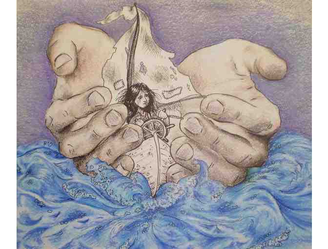 Our artistic team drew insipiration from the overarching idea in Psalms that no matter what we do, or how we steer our lives, we are in G-d's hands. Prayer and belief can comfort and guide us, but ultimately, our fate is beyond our control. The image of a small boat in the middle of a vast ocean, yet held by G-d's hands, represents the idea that our destiny is not necessarily within our own grasp.