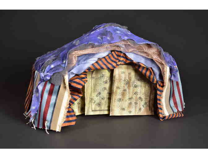 Chava, whose artwork has dealt with space, paints the Helix Nebula. This "Eye of G-d" sends rainbow light beams to the world and space. Leslie portrays the Heavens created by G-d as a tent (Ps:19) sheltering humankind. We form enduring bonds with G-d by turning our eyes to each other. The net connecting our artwork symbolizes enduring bonds and energy flowing between G-d above and humankind sheltered below within His Tent.