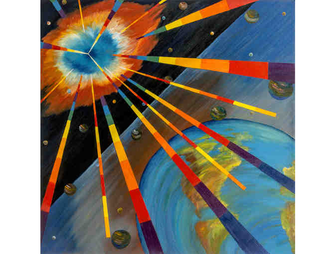 Chava, whose artwork has dealt with space, paints the Helix Nebula. This "Eye of G-d" sends rainbow light beams to the world and space. Leslie portrays the Heavens created by G-d as a tent (Ps:19) sheltering humankind. We form enduring bonds with G-d by turning our eyes to each other. The net connecting our artwork symbolizes enduring bonds and energy flowing between G-d above and humankind sheltered below within His Tent.