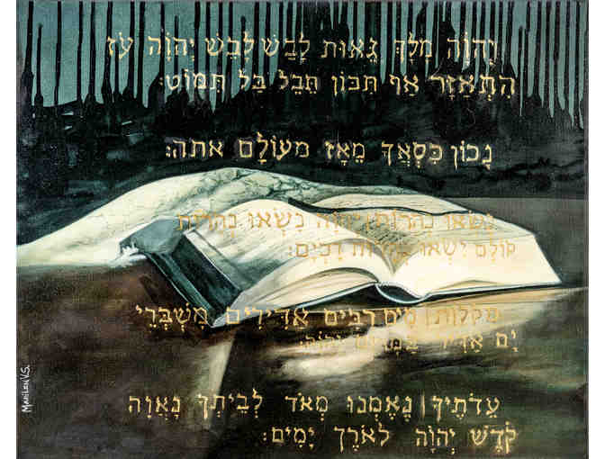 The open book and the light represent the openness to an intimate dialogue between us and G-d. The cylinders, containing the elements of Nature, represent us in our search for G-d. The powerful Hebrew letters while praying with the "kavannah" (intention or direction of the heart) elevates us to a state of consciousness closer to the Light.
