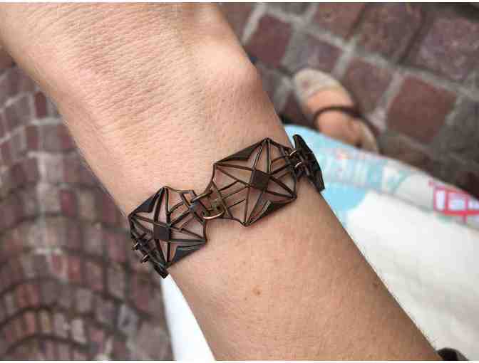This art deco style star link bracelet by Ornamental Things is made of aged brass filigree with a brass clasp.
