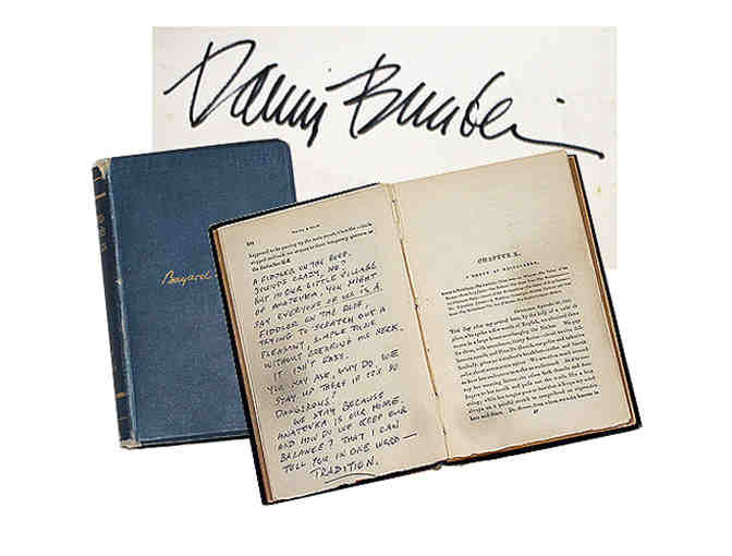 Fiddler on the Roof prop book, signed by Danny Burstein. Mr. Burstein's opening monologue is handwritten on page 104.