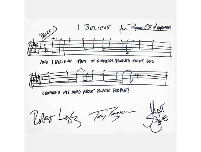 C. From the score of The Book of Mormon: “I Believe” handwritten and signed by Tony Award-winning composers and lyricists Robert Lopez, Matt Stone and Trey Parker.