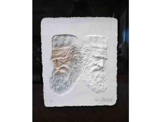 Professionally framed relief on cast paper by Carlo Wahlbeck. This piece is based on an oil painting of Wahlbeck’s called “Two Faces of Wisdom.” It features simple coloring and fine mold work.