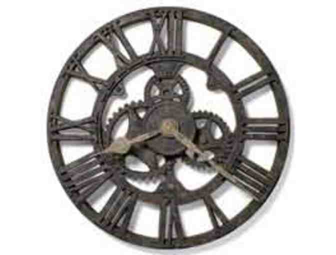 The character of a rusted, antique timepiece is evident in this 21" molded polyresin wall clock. Aged hour and minute hands add to the appeal of the authentic look. Quartz, battery operated movement.
