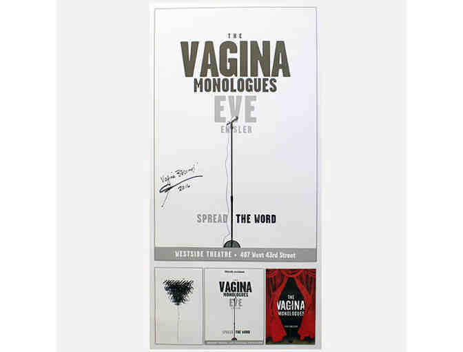 Framed poster featuring selected and rejected artwork from The Vagina Monologues and autographed copy of Drew Hodges' book "On Broadway: From Rent to Revolution," poster signed by Eve Ensler