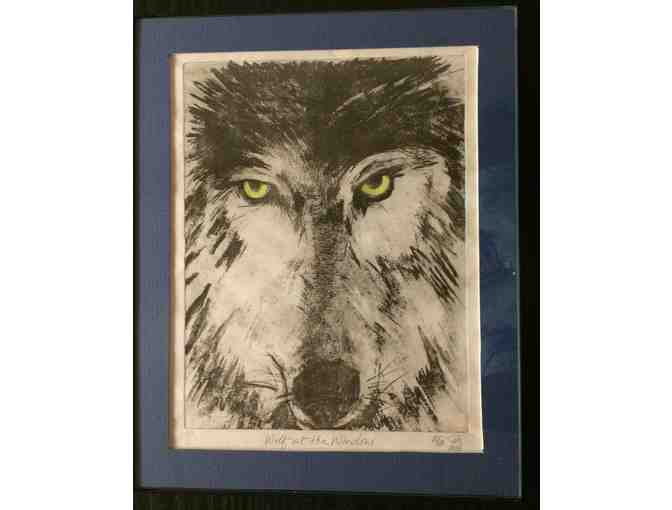 A hauntingly beautiful lithograph print of the face of a wolf, print #2 of 8 donated by artist Patricia Gateley.