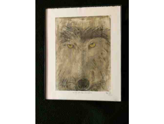 A hauntingly beautiful lithograph print of the face of a wolf, print #7 of 8 donated by artist Patricia Gateley.