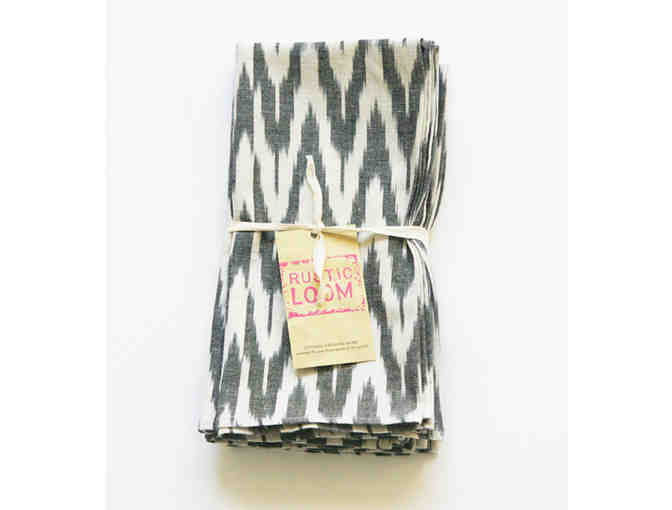 Handwoven grey ikat zig zag cloth napkins- set of 4 100% Cotton 20" x 20" square Machine wash cold. Tumble or line dry. 100% cotton handwoven cloth napkin. These napkins are sourced from a nonprofit organization in India who employs disadvantaged women to sew items, and works with traditional ikat weavers who hand weave cloth. By buying these napkins, you are supporting sustainable, ethically sourced products! Amazingly soft fabric, great hand feel, and beautiful on your table. Every piece is sewn with a cloth Rustic Loom label, and attached with a beautiful hang tag with a description of Rustic Loom's process. These napkins get softer with each wash and will last for years and years to come! Color: Grey, natural white Mix and match napkins with our stripe, dot, and wax print designs. See more stories of the artisans an learn about the culture where this piece comes from on our website: www.rusticloom.com.
