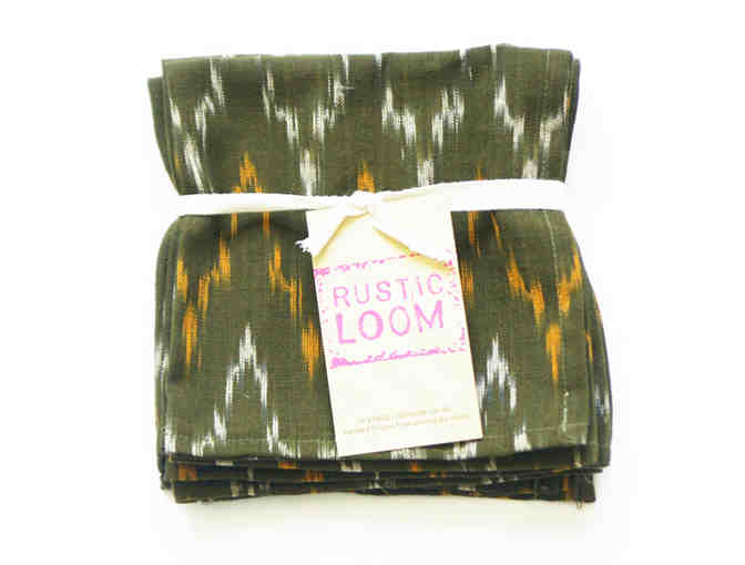 Handwoven Cotton Cloth Cocktail Napkin- Olive Green Ikat Zig Zag- Set of 4 100% Cotton 12" x 12" square Machine wash cold. Tumble or line dry. These napkins are sourced from a nonprofit organization in India who employs disadvantaged women to sew items, and works with traditional ikat weavers who hand weave cloth. By buying these napkins, you are supporting sustainable, ethically sourced products! Amazingly soft fabric, great hand feel, and beautiful on your table. Every piece is sewn with a cloth Rustic Loom label, and attached with a beautiful hang tag with a description of Rustic Loom's process. These napkins get softer with each wash and will last for years and years to come! Color: Greenish Brown, orange, natural white Mix and match napkins with our stripe, dot, and wax print designs. See more stories of the artisans an learn about the culture where this piece comes from on our website: www.rusticloom.com.