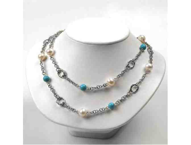 Enjoy this unique and highly detailed stunning solid 925 sterling silver necklace detailed with Freshwater pearls and turquoise beads. Length 37" with a toggle clasp and a beautiful textured detail.