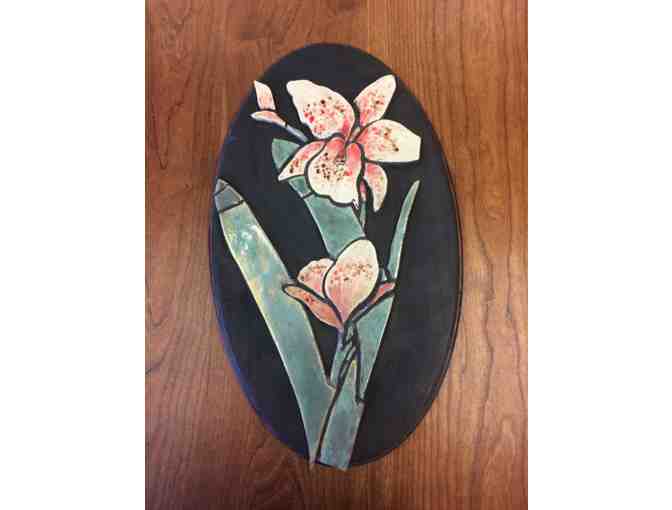 Handcrafted by amazing local artist and long-time KHS volunteer. This orchid is made from individual tiles each piece shaped, painted and then reassembled in the style of stained glass. Mounted on stained, solid wood with finished edge. Size approx. 12” x 20”.