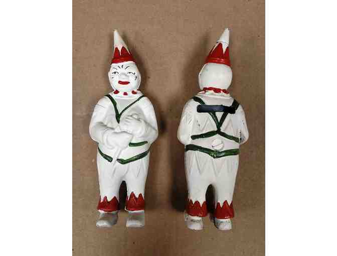 Set of two 6" vintage cast iron coin banks shaped like lovable circus clowns.