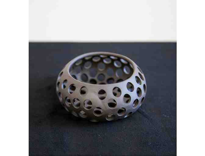 A geometric black ceramic bowl w/ lace-like holes made of midrange electric fired porcelain, perfect to display an air plant or use with a tea light.