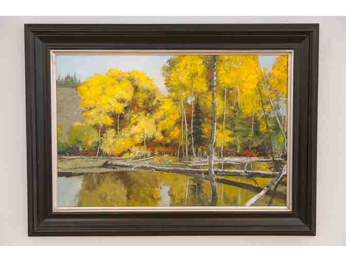 An original landscape oil painting entitled "Wolfcreek Aspen" shows the crisp clear fall colors of aspens reflecting on the water of a mountain waterway. Ready to hang in a black frame with gold accent.