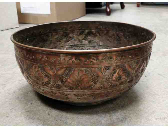 5.5” tall, 11.5” diameter hammered copper bowl with highly detailed floral pattern, made in Israel.