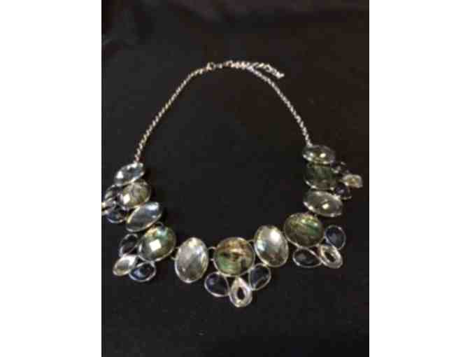 Picture yourself dressed up and ready to go. Then add this elegant silver-tone black and clear abalone glass stone necklace to top-off the perfect look.