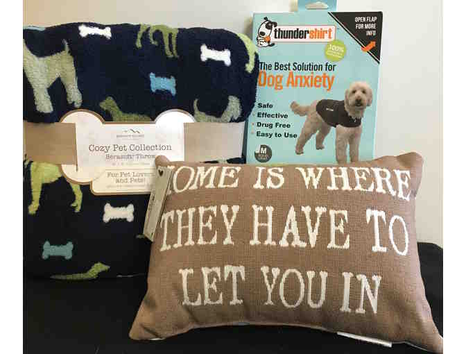 You and your pooch can cozy up together with this medium size Thundershirt, 60" x 70" soft throw with a dog and bone print and "home is where they have to let you in" decorative pillow.
