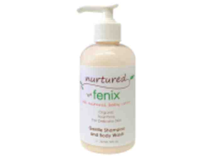 Natural Fenix Cosmetics baby skin care gift basket with one (1) Bloom Hydrating Lotion, one (1) Gentle Shampoo and Body Wash, one (1) Nourishing Body Lotion, one (1) Bottom Butter Balm, one (1) Ginger Citrus Body Scrub, one (1) White Tea Hydrating Lotion, and one (1) fox stuffed animal.