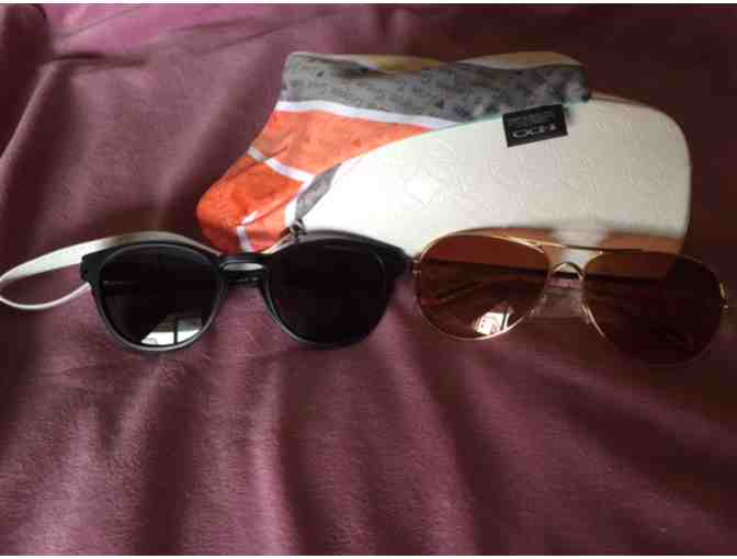 Two (2) pairs of brand new Oakley sunglasses. One in aviator style and one black pair.