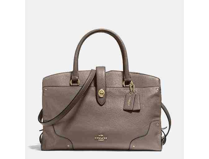 Go in style with Coach’s Mercer satchel in versatile light gold/fog. Soft Grain leather with an easy drape makes this softly structured bag remarkably light in weight and rich in texture. Corner details and workwear rivets add a downtown attitude to its well-organized, three-compartment silhouette.