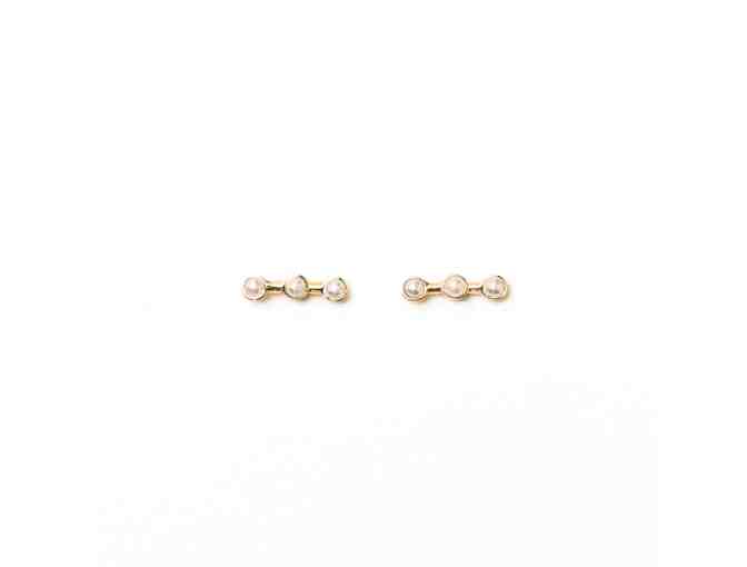 Wear these beautiful earrings from madeLOKAL.com, designed and handmade in California! Each earring includes 3 1-pt opals, bezel-set in 14K gold and soldered together to form a small horizon bar on a classic stud earring post.