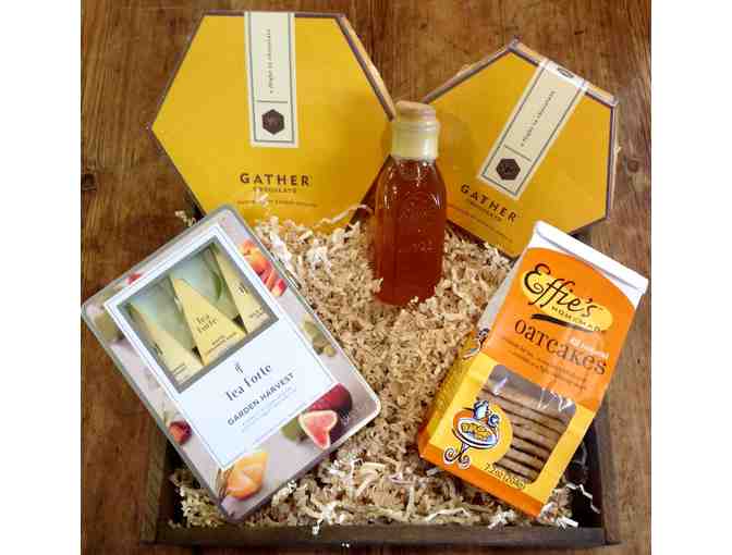 A delightful assortment of New England goodies packaged in a wooden tea tray: two boxes of Gather Chocolate, one 6 piece and one 12 piece, Tea Forte tin of assorted teas, Effies's Homemade Oatcakes and 8 ounces of Ipswich raw honey!