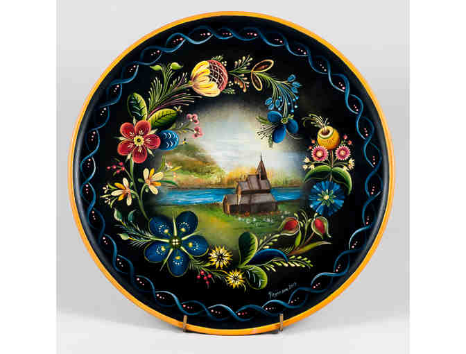 14"D. Center scene includes a stave church alongside a fjord. The church is surrounded by Os-style flowers. Signed and dated by artist. Artist: Jeanette Reyerson.