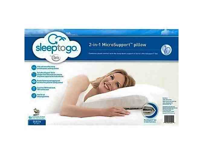 The Sleep to Go 2-in-1 MicroSupport™ Pillow features an allergen-free latex foam core designed to provide deep down support to the head and neck. It is made to resist flattening and sagging over time.