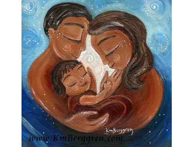 12x12 original painting by Katie M. Berggren, www.kmberggren.com. Identity Painting includes an acrylic painted stylized portrait featuring mother, father and child, size 12x12¿, stretched canvas, wiring included, no framing, canvas has painted edges and all painted surfaces have gloss, UV protective varnish.