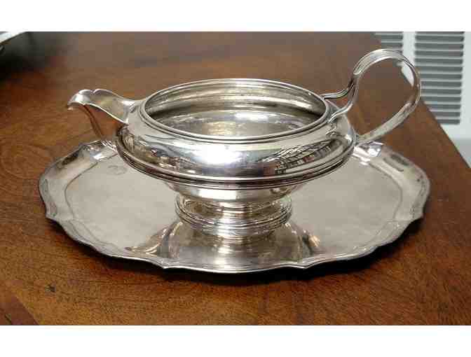 Elegant, early 1900s genuine silver Bonebakker & Son, Dutch 3.5”x6.5” sauceboat paired with an 8.5” Fisher silverplated tray.