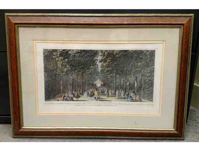 Colored print by Jacques Rigaud featuring leisurely passerby observing the white marble statues lining the hedges of the Garden of Versailles. The original was etched and produced in the 1730’s. This framed print measures 30”x21”.