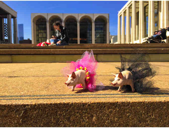 Swine Lake, a Plastic Farm Animals of New York photograph (PFANY) is from the unique series, Plastic Farms Animals Amock. It was taken at Lincoln Center, in New York City, in front of the American School of Ballet with some of the best plastic farm animal dancers in the business.