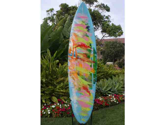 The board is an 8'2" fun gun shaped by Slick. In order to be prepared for painting, it was sanded and then later glassed by Joe Roper's Custom Surfboard and Sub Repair Shop.