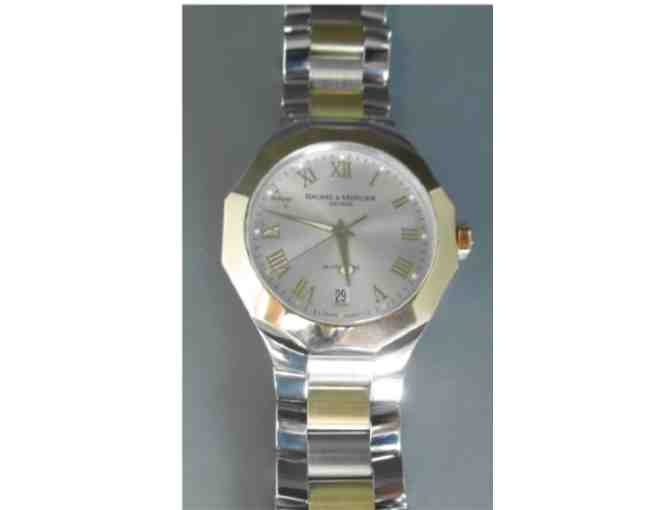 One mans watch by Baume and Mercier with an automatic wind movement, dodecagonal shaped case in 18K yellow gold and stainless steel. The dial is white with gold colored Roman numbers and hands with a calendar aperture at 6 oclock. The watch is No 4608190 with a case serial number of 65583 and is stamped SS 750 (stainless steel and 18K gold). The band a spring loaded deployment buckle.