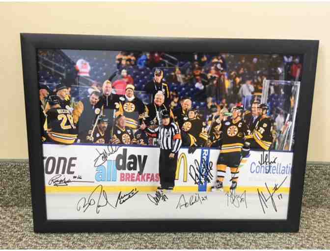 Enjoy a photo of the Bruins players and Don Garcia, the referee, at the bench from the 2016 NHL Winter Classic Alumni Games which was played at Gillette stadium! This is 13" X 19" framed and has orginial autographs!