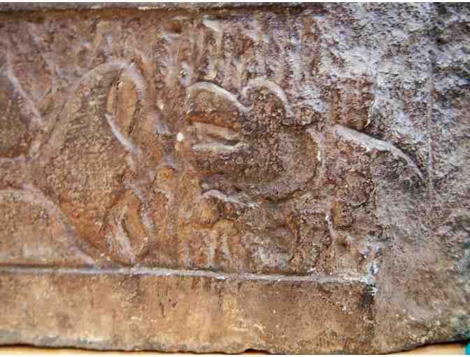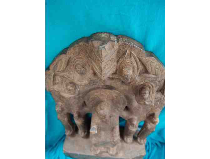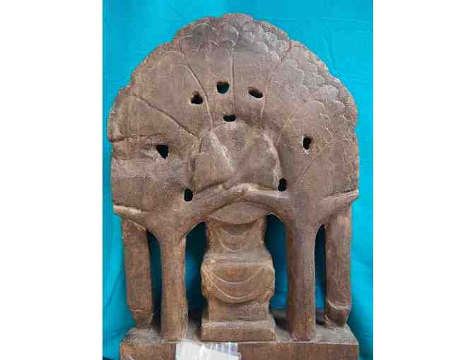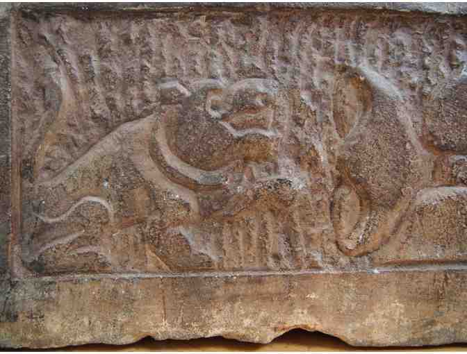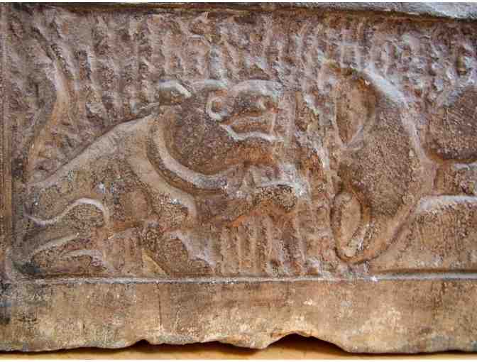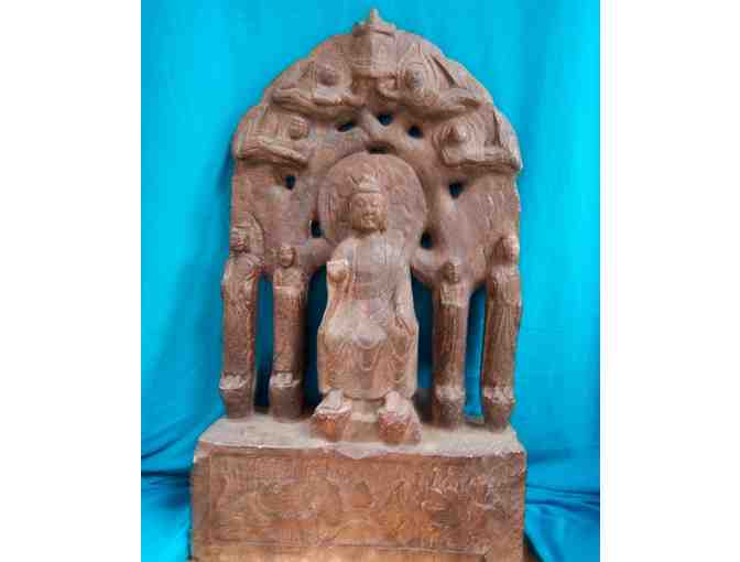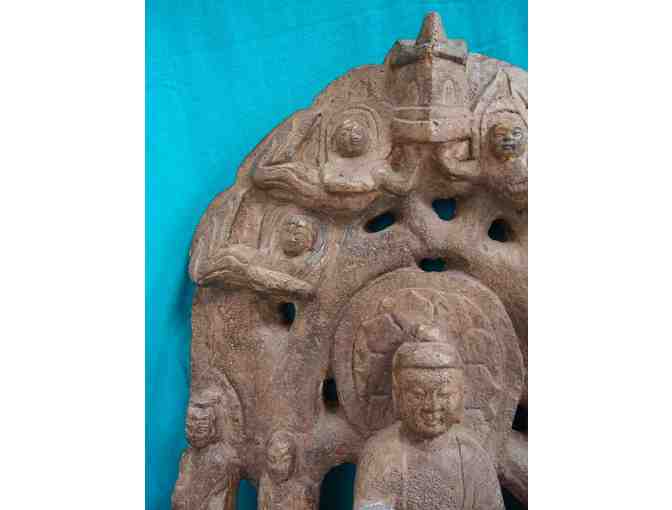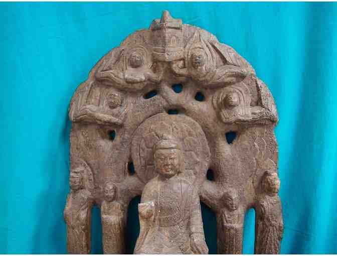 "Truly one of our masterpieces in our collection, this relief is entirely different from most Buddhist art found in China, and even shares similarities with early Christian art. Enthroned in the center and flanked by four attendants, the Buddha sits with each foot placed atop a lotus while beautiful celestial beings fly in the air. The base of the relief features a Kirin, a mystical creature in Chinese mythology. A rare and highly collectable piece."