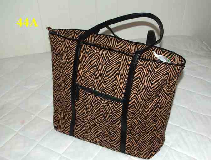 This beautiful zebra pattern tote features four leather trimand six (6) pockets inside. Large enough to hold files or a laptop.
