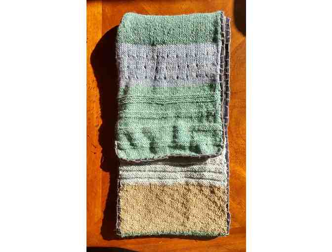 This 60” fleece-lined, handmade scarf features multiple knit patterns and soft colors to ward off the chill this winter.