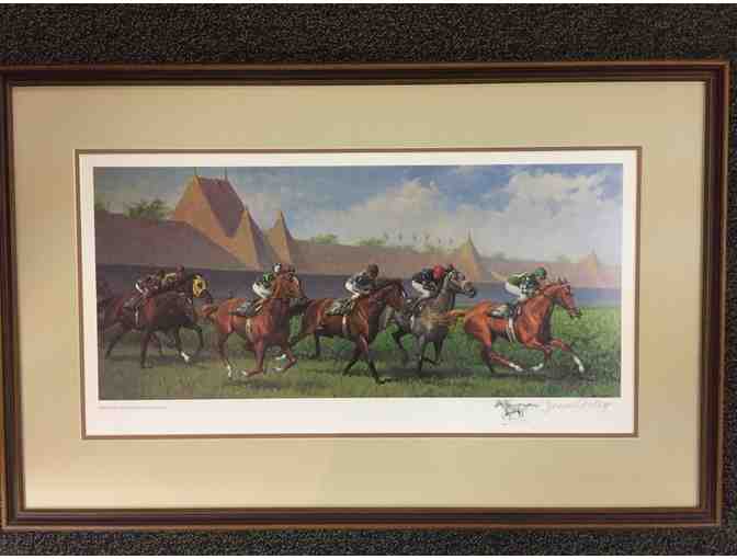 Framed print "Turf Racing at Saratoga" signed by the artist, Jenness Cortez