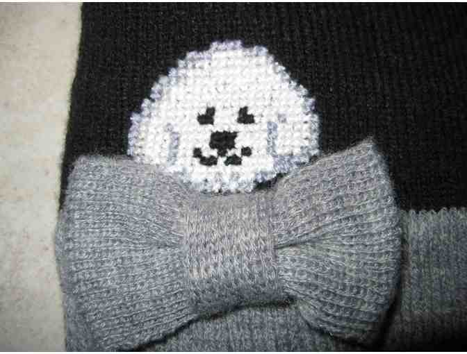 Adorable headband with bow and cross stitched Bichon head.